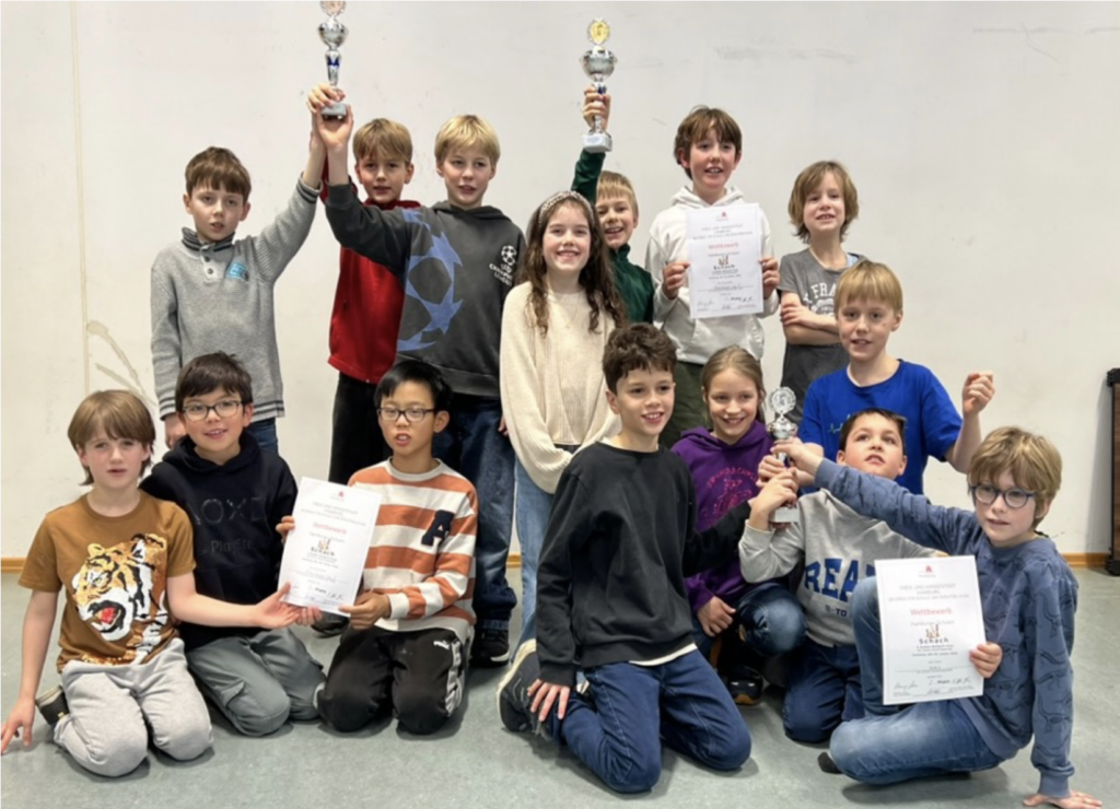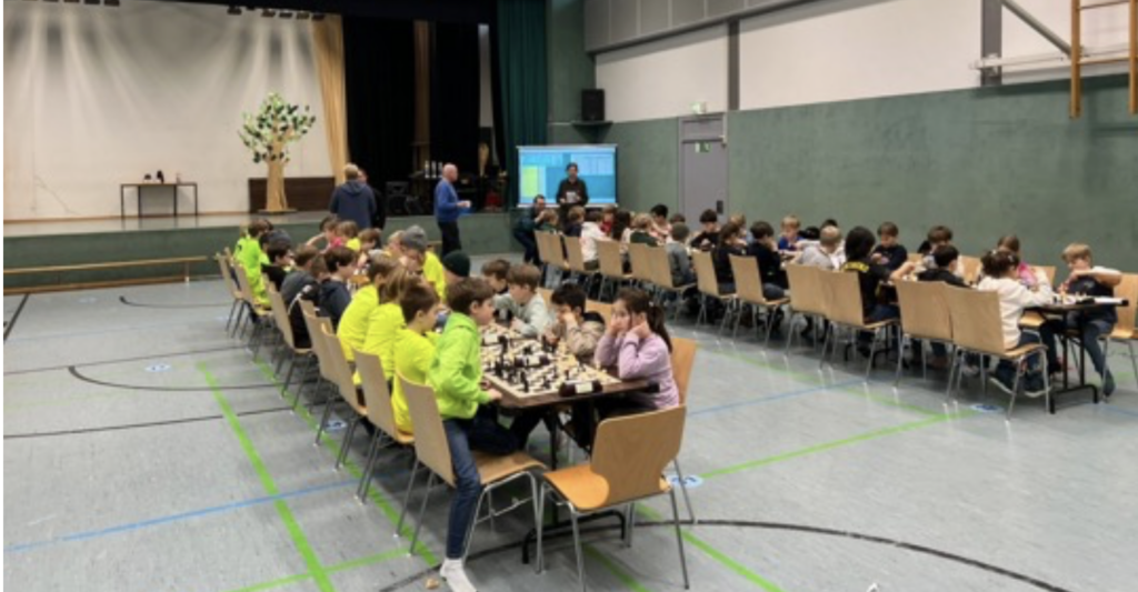 Der 1. Eulen-Schach-Cup an unserer Schule fand am 29.01.26 statt. In der großen Sporthalle nahmen 14 Teams aus drei Schulen an dem Schachturnier mit 4er-Teams teil. Gespielt wurde in 7 Runden nach Schweizer-System. Die Kinder hatten 15 Minuten Bedenkzeit, so dass eine Partie maximal 30 Minuten. dauerte. Somit durften sich rund 70 Schüler*innen den gesamten Vormittag in der Zeit von 9.00 bis 13.00 Uhr im Schachspiel messen und um die begehrten Pokale kämpfen.
